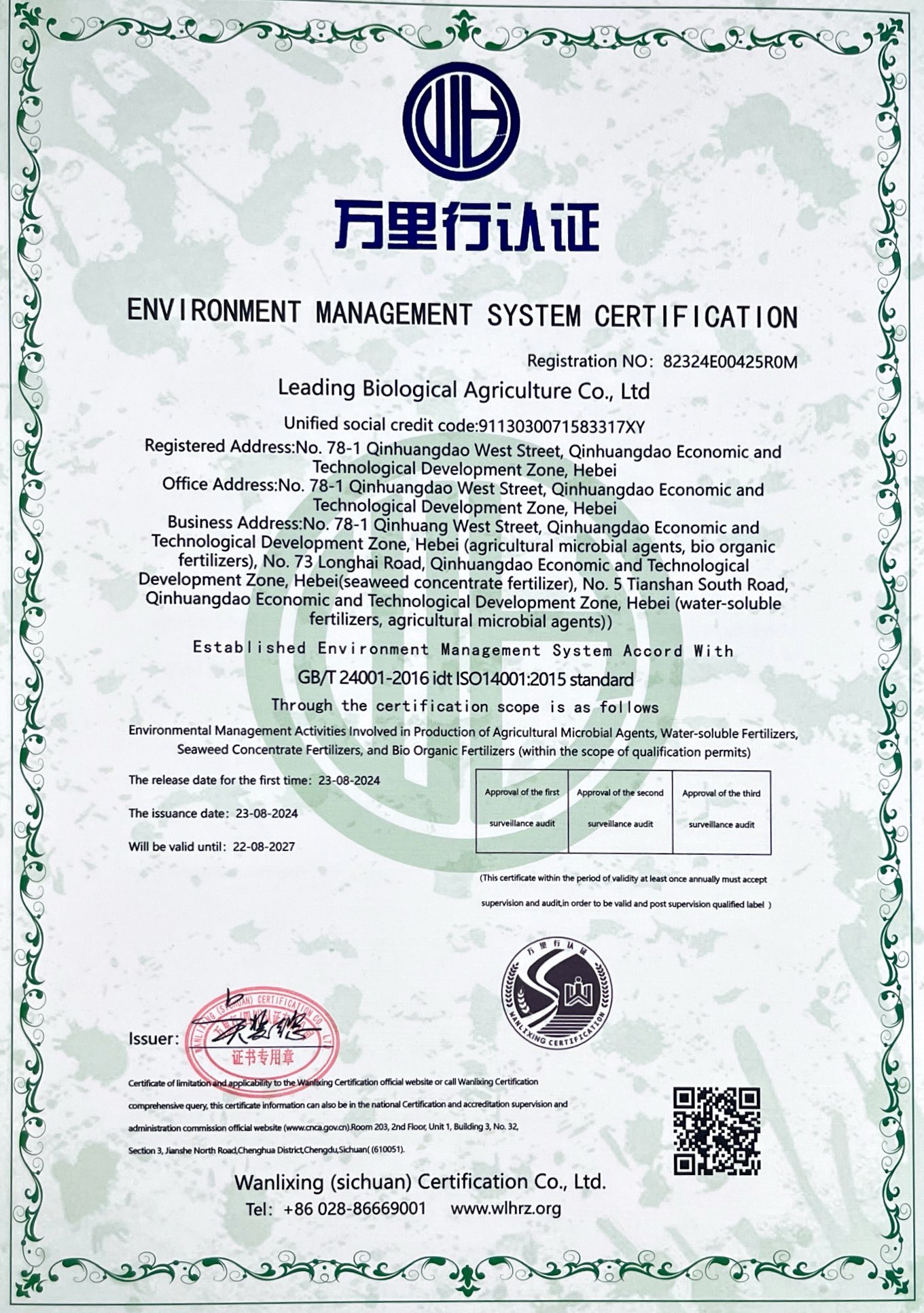 環(huán)境管理體系認證證書