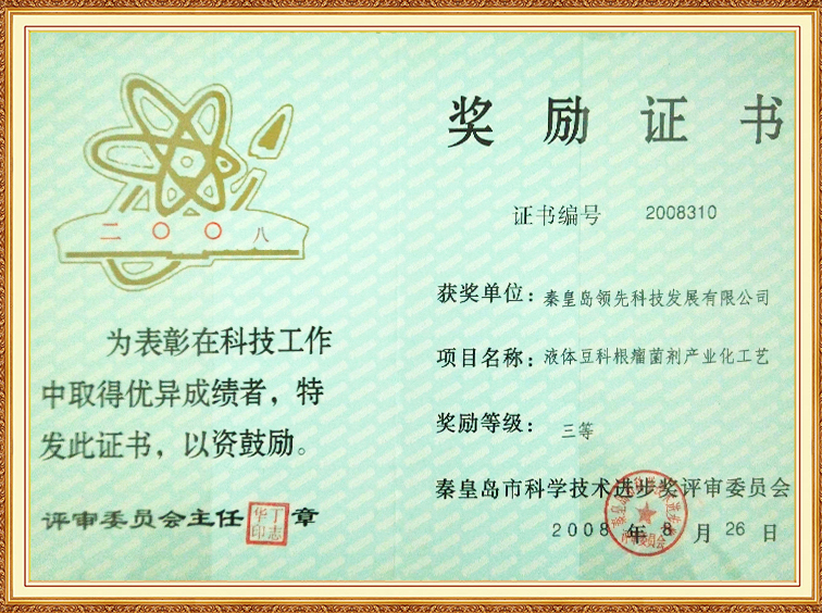 液體豆科根瘤菌劑產(chǎn)業(yè)化工藝—秦皇島市科學(xué)技術(shù)進步三等獎